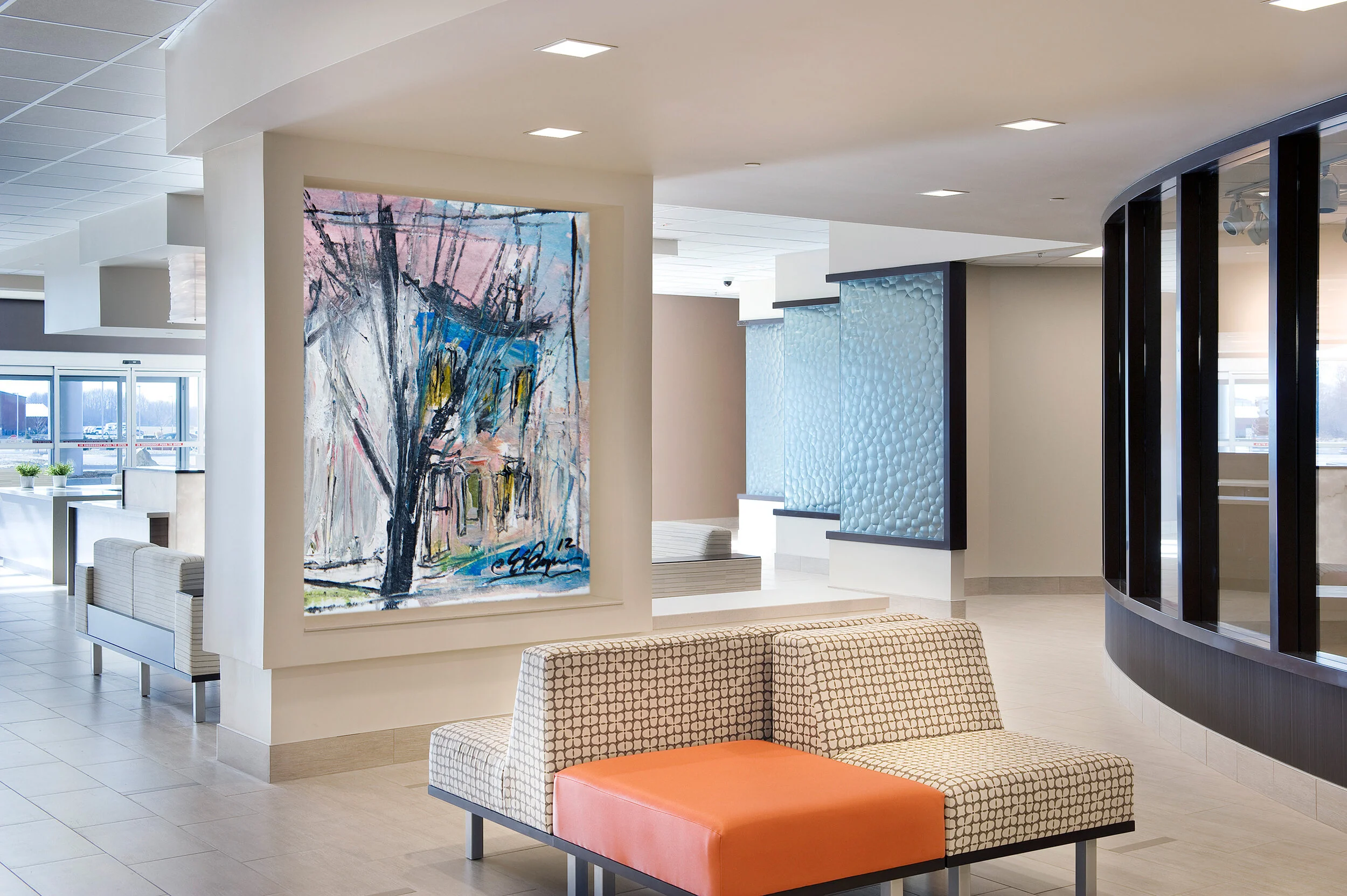 Thus, ARTEKNA’s design team and King’s Daughters’ Health embarked on a journey to design a campus that will provide patients with state-of-the-art technology and services. The new hospital with attached Community and Medical Arts Center opened in February 2013. The design emphasizes patient-focused strategies, on-stage vs. off-stage concepts, the healing qualities of natural light, efficient space layouts and travel distance considerations. It was constructed on a portion of the hospital’s new 96-acre campus, which includes dedicated areas of future expansion opportunities.
